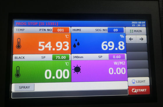 2. রঙিন টাচ স্ক্রিন, রিয়েল-টাইমে চেম্বারের অবস্থা নির্দেশ করে, বিকিরণ, তাপমাত্রা (বিপিটি, বিএসটি, চেম্বার), আর্দ্রতা এবং সেগুলির গতিশীল বক্ররেখা প্রিসেট করতে সক্ষম হবে।অপারেটর কেবল প্রয়োজনীয় পরীক্ষা মডিউল এবং পরীক্ষার মান নির্বাচন করে;ইংরেজি ইউজার ইন্টারফেস, ডায়াগ্রাম চেম্বারের অবস্থা নির্দেশ করে, ব্যবহার করা সহজ;